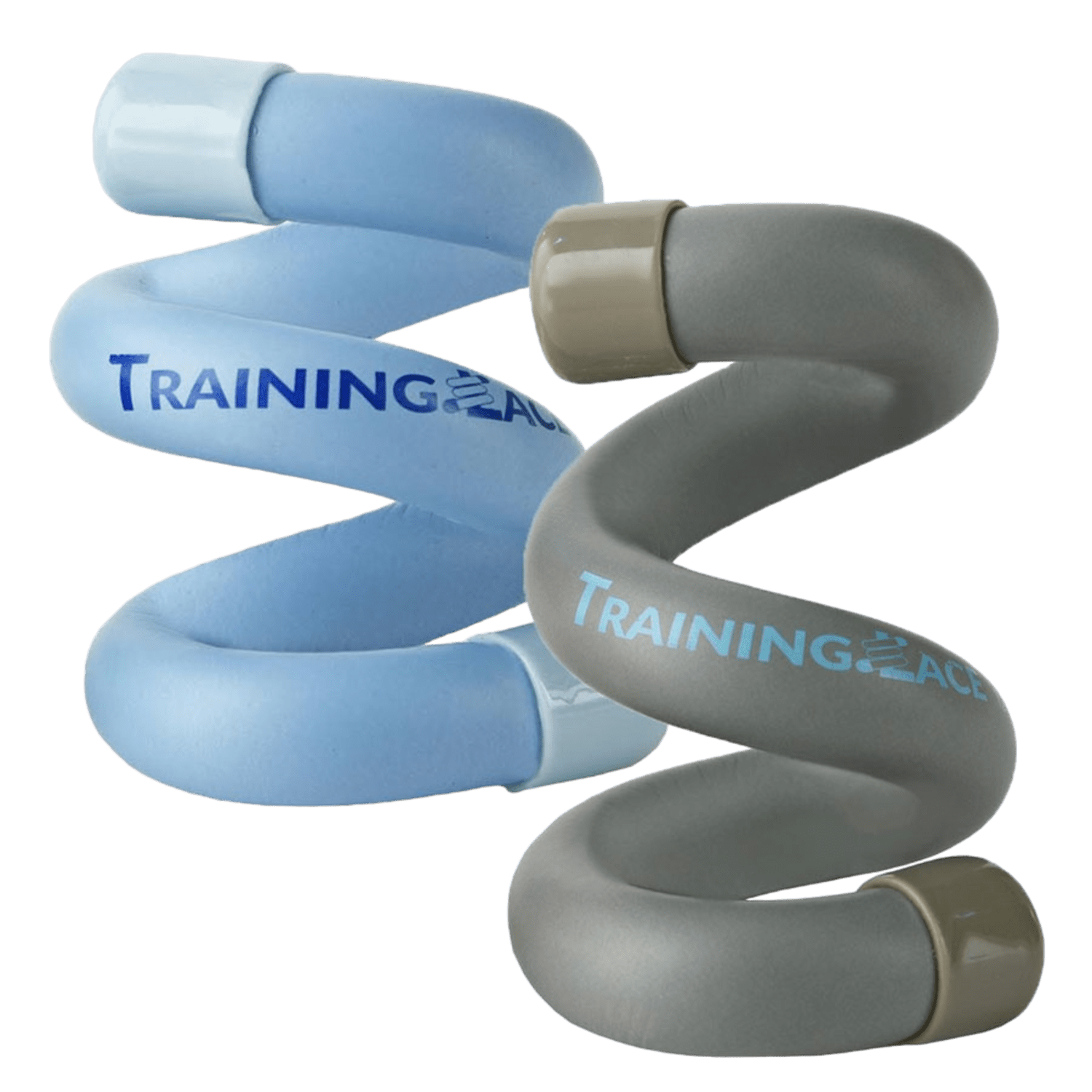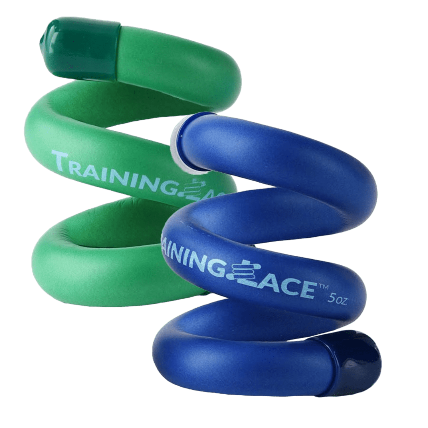 A LaceUp Lacrosse stick is featured, designed especially for training. It showcases white material with red and blue netting, while red bands around the handle ensure vibration-absorbing comfort. The stick also sports a stylish American flag detail near the base, all set against a plain green background. Introducing the LaceUp Lacrosse 5oz. Training Lace by LaceUp: a red, flexible, spiral-shaped rubber accessory with gray caps on each end. Expertly crafted to absorb vibrations during lacrosse training, this essential tool stands upright to help enhance shot speed and accuracy.