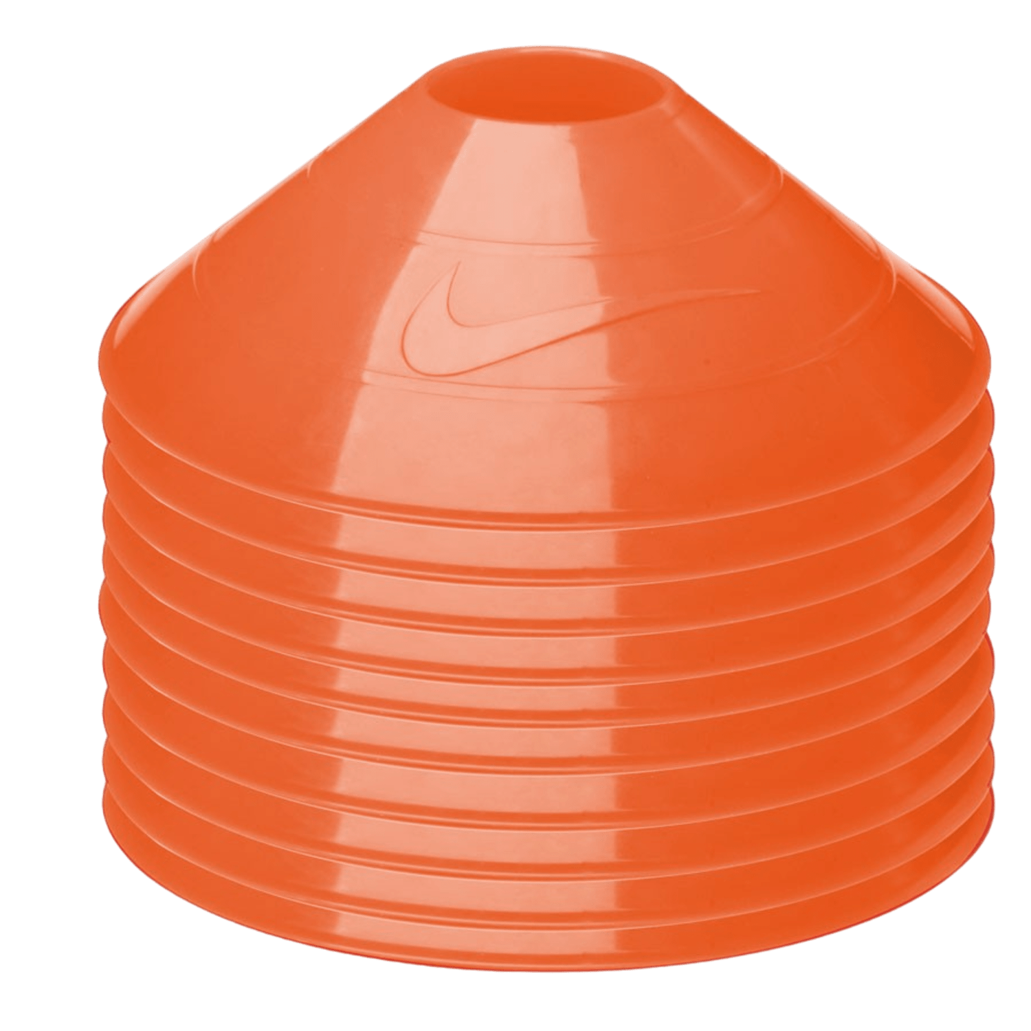 A set of Nike Training Cones - 10-Pack, featuring a logo on top, is prepared on the practice field. Designed with small dome shapes, these orange plastic cones are ideal for lacrosse drills and various sports practices.