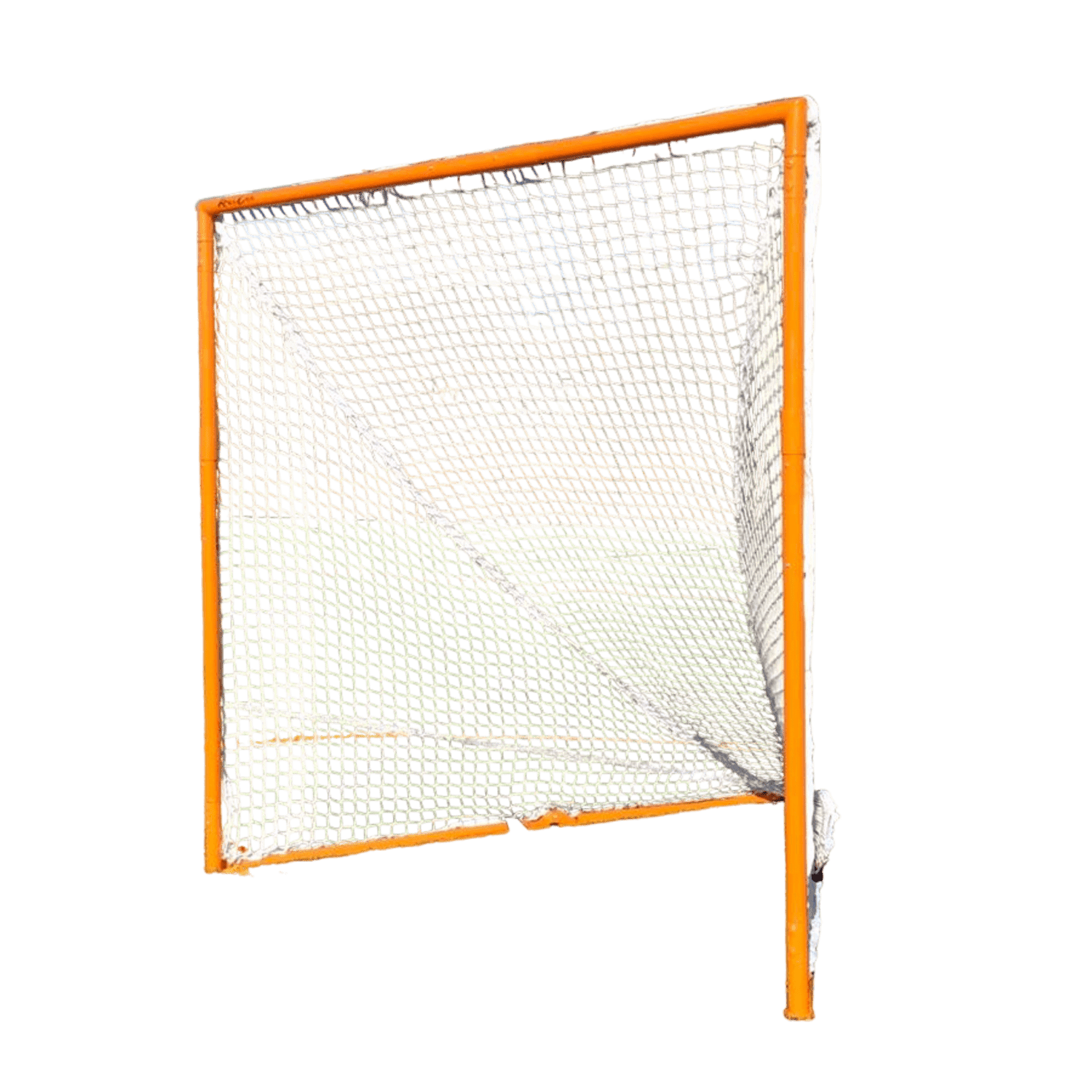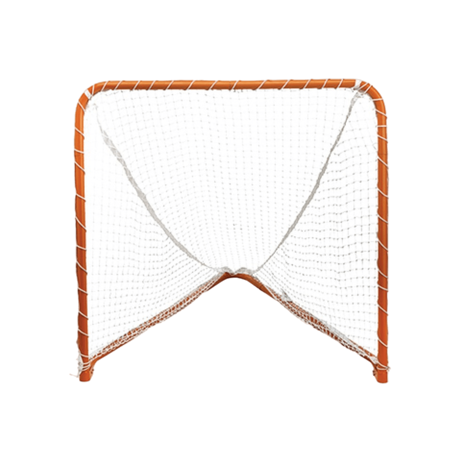 The Hot Bed Lacrosse Stock Backyard Goal with a vibrant orange frame and durable 4MM white netting stands tall. The netting is slightly stretched, forming a gentle curve. This expertly crafted lacrosse goal is displayed against a white background, highlighting its superior quality.