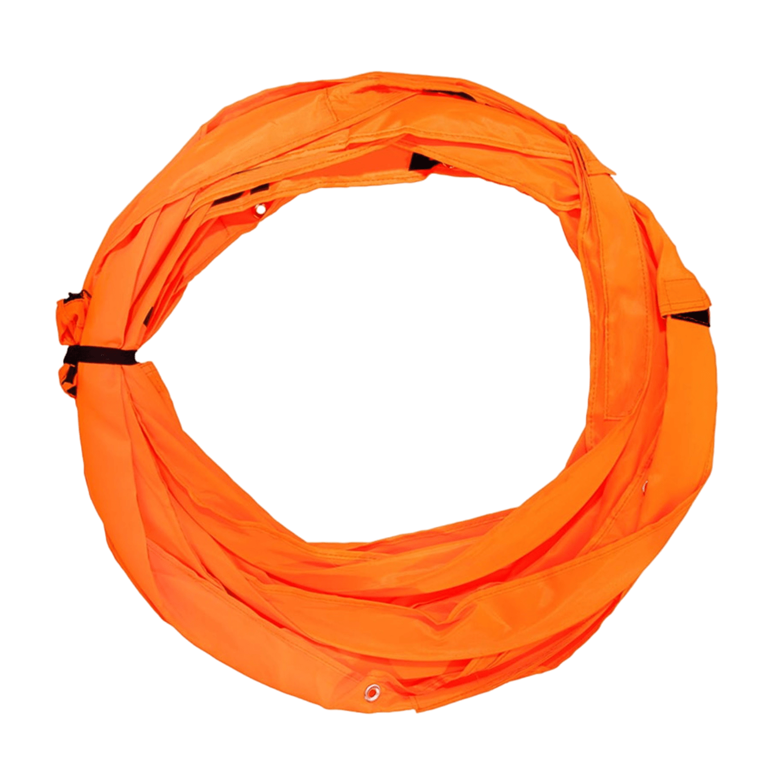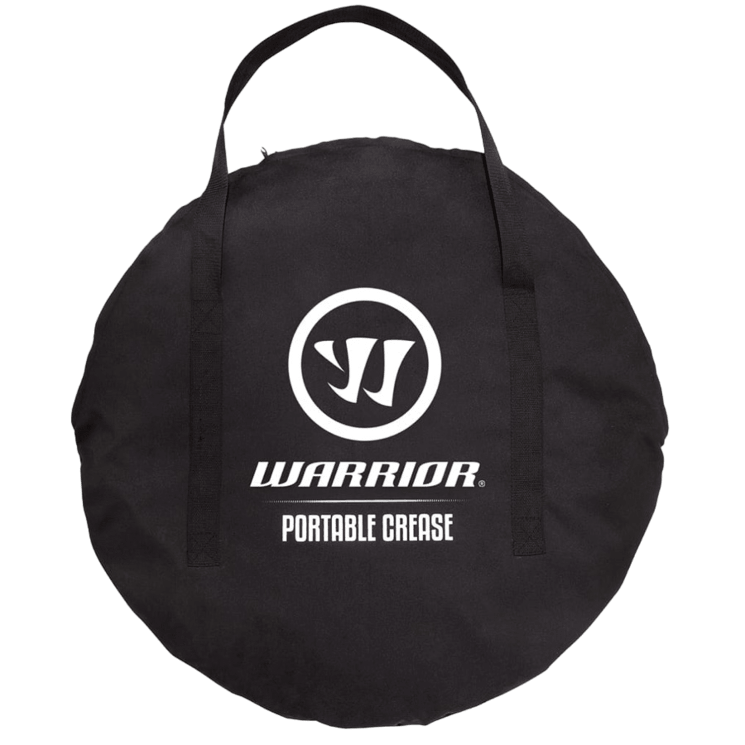 Round black carrying case with handles, displaying the Brine logo and the text "Warrior Portable Lacrosse Crease" in white letters. Perfect for turf fields, it provides versatile usage with adjustable sizes to suit your requirements. The Brine Warrior Portable Lacrosse Crease, with its vibrant orange hue and circular design, stands out against a plain background much like a rescue throw bag on turf fields, underscoring its adaptability in unpredictable situations.