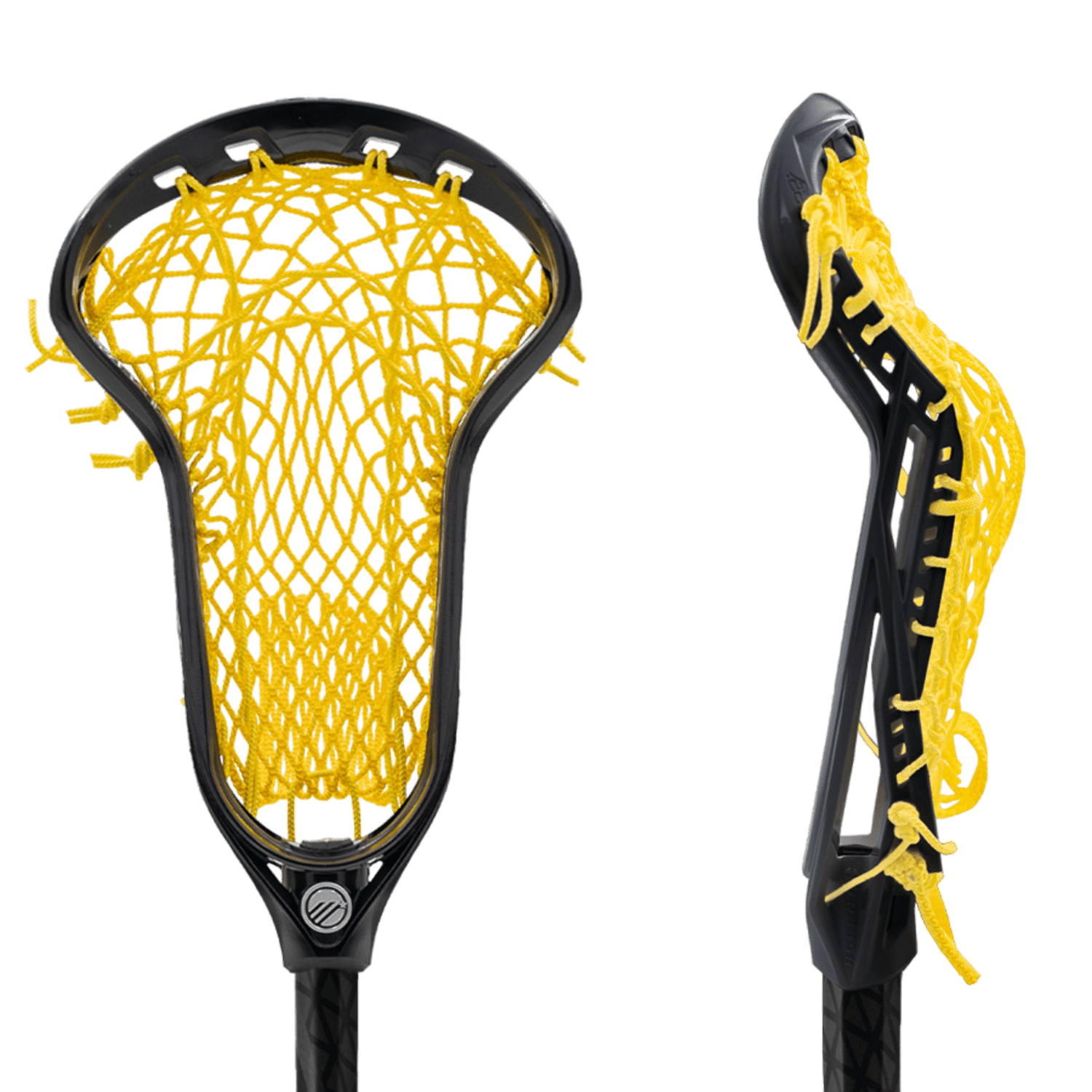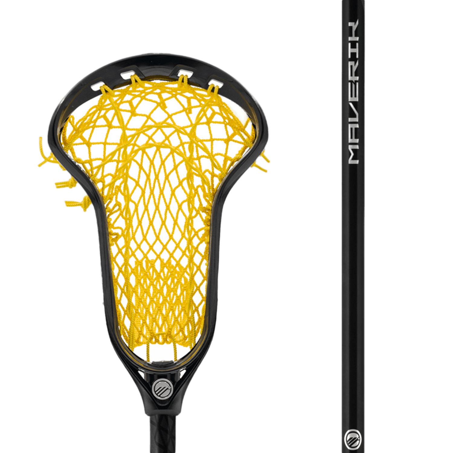 The Maverik Ascent+ FM Complete Stick is equipped with a yellow mesh net and a black shaft labeled "Ruler," crafted for powerful shots. Its traditionally shaped head guarantees excellent ball control and is prominently displayed along the handle. Front and side view of the Maverik 3003344EACH lacrosse stick head, featuring XRAIL technology with a sleek black frame and vibrant yellow netting for optimal performance.