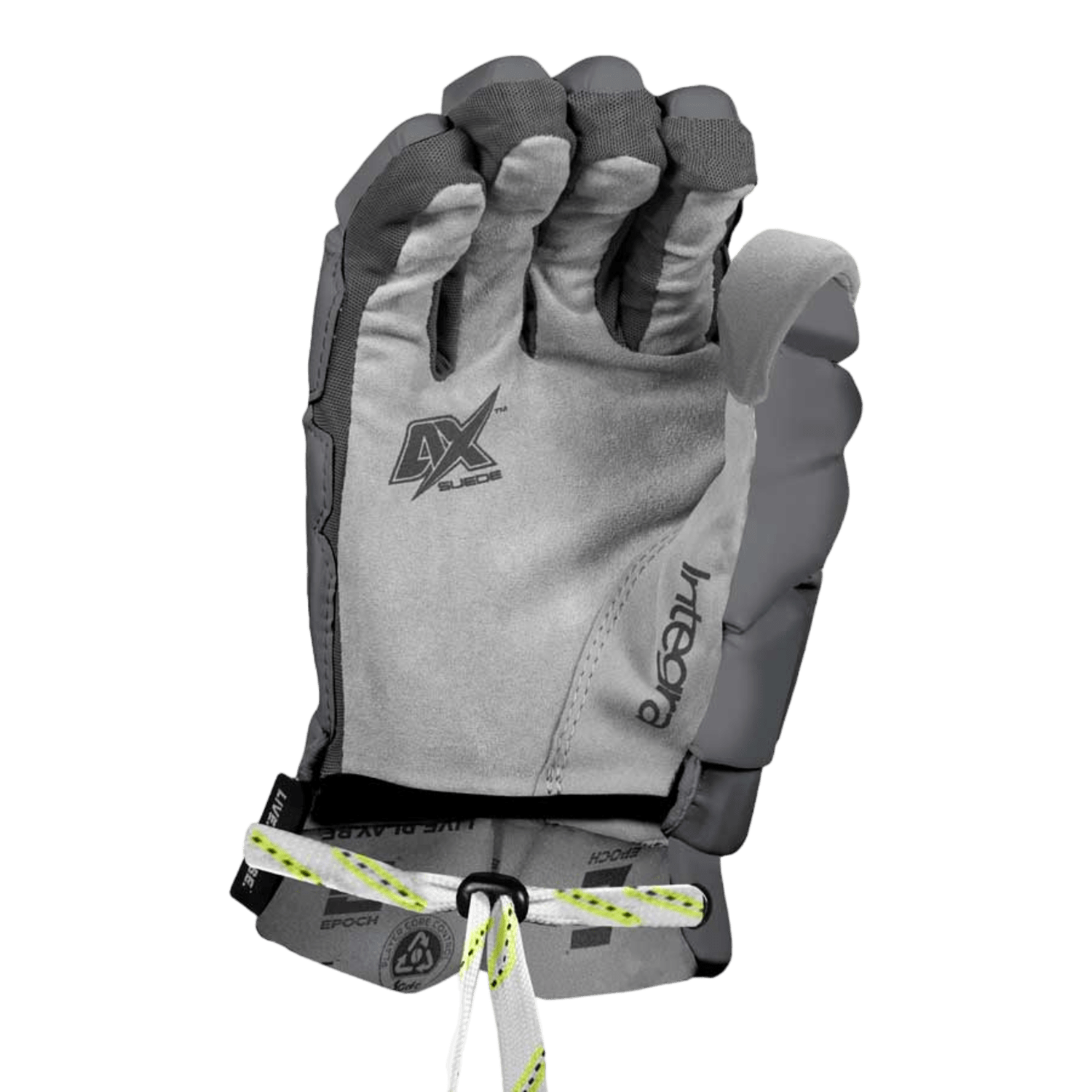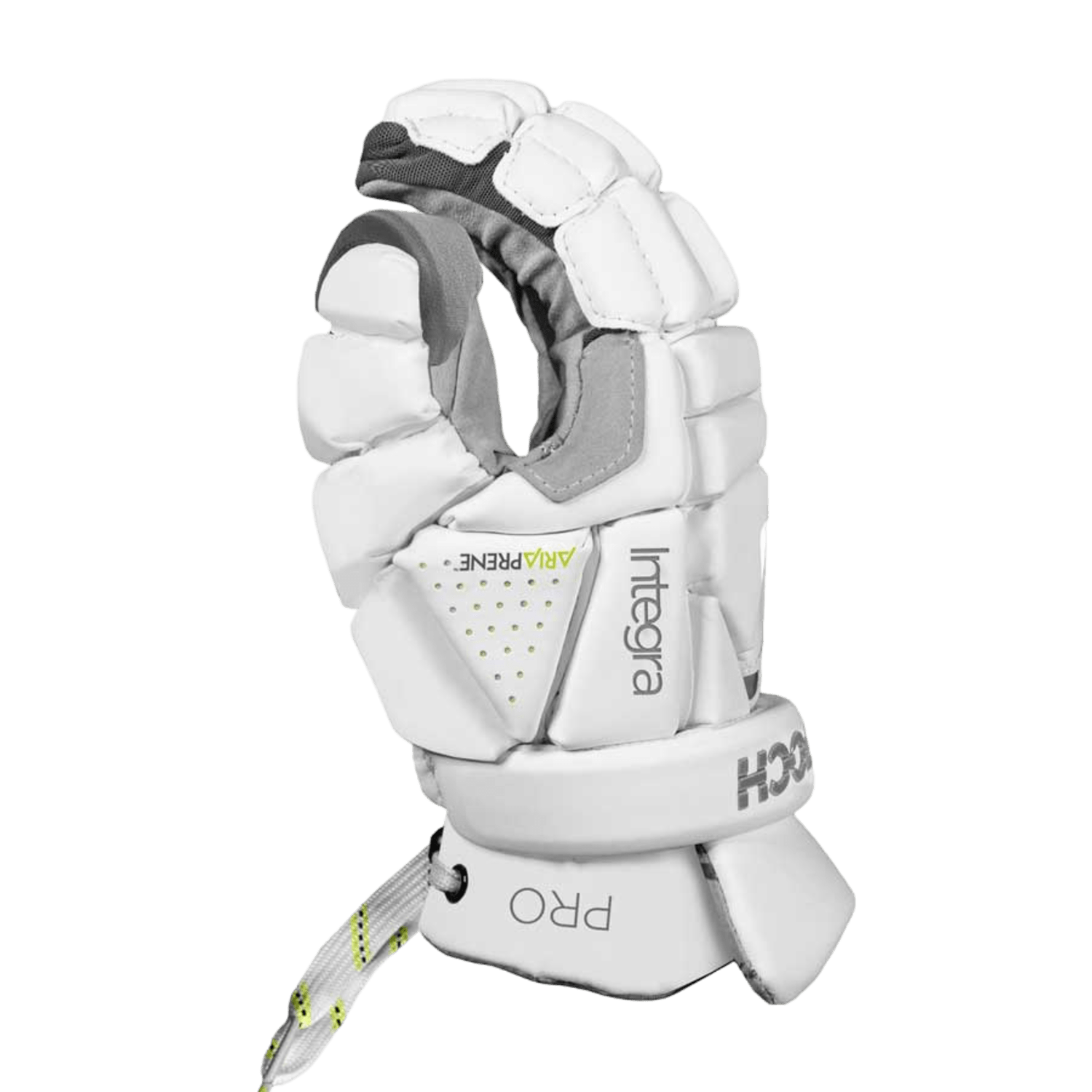 The Nike Vapor Elite 2021 Lacrosse Gloves, featuring the signature black swoosh logo, excel with their premium leather palm for improved grip and durability. Prioritizing comfort and safety, they include segmented fingers and a secure wrist strap. Close-up of a grey and white sports glove featuring "Corelite" branding, reminiscent of the Nike Vapor Elite 2021 Lacrosse Gloves. The design includes premium leather palms, reinforced padding, mesh ventilation, and an adjustable wrist strap with black and yellow accents. The fingers are slightly curled.