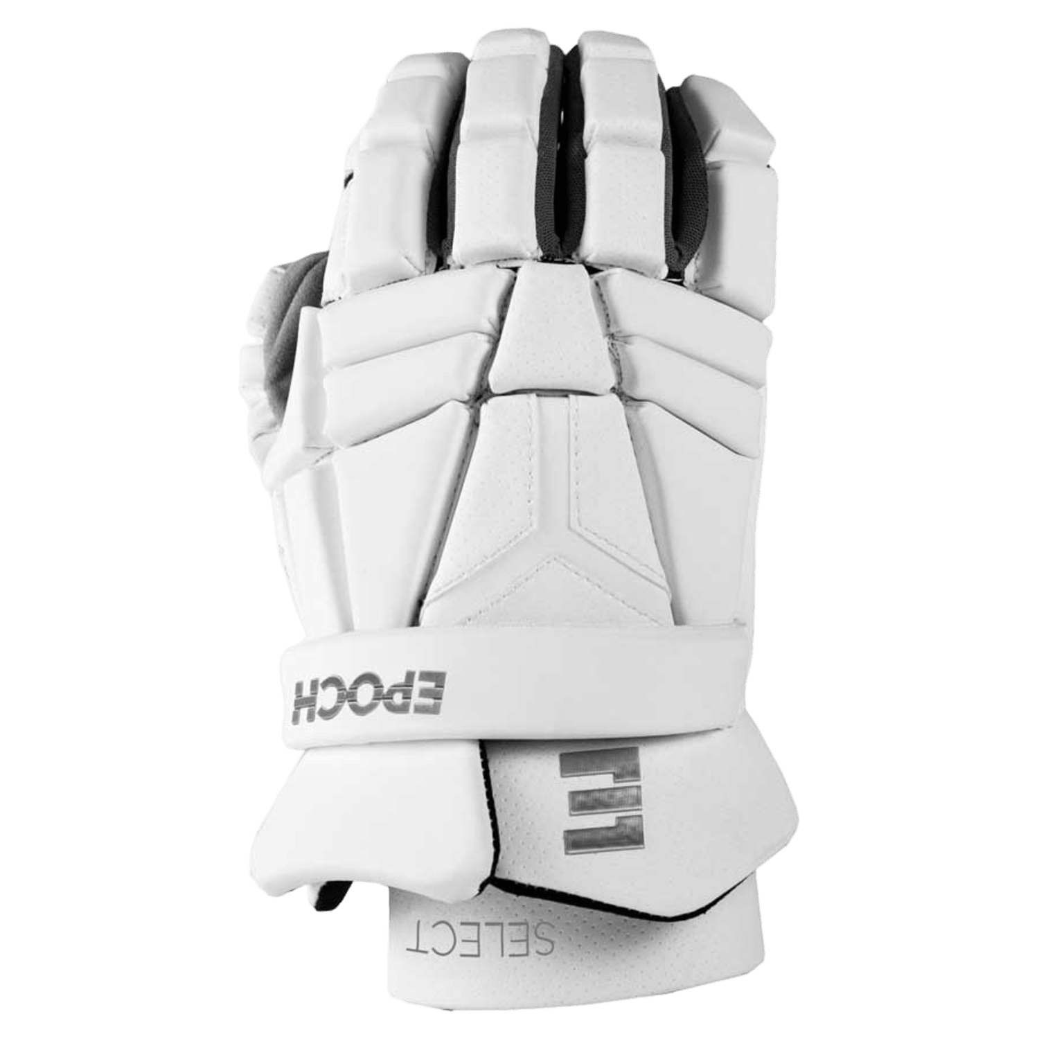 Introducing the Nike Vapor Select Lacrosse Gloves in white, designed with padded segments for enhanced protection. Featuring a black swoosh logo on the wrist strap and a ventilated palm, this glove stands upright against a plain background, highlighting its protective foam design. A lone glove designed for cricket, showcasing protective foam padding and fabric ventilation, is displayed with the palm facing up against a simple backdrop. The glove is mostly white with gray details and features a secured wrist strap, with a design akin to Nike's own Vapor Select Lacrosse Gloves.