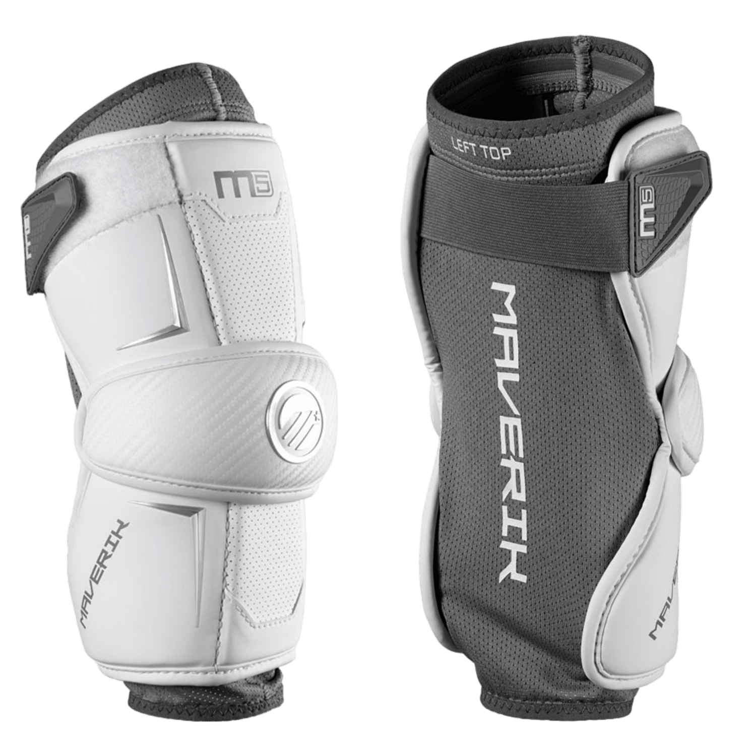 Two protective athletic arm pads are displayed. The left pad is white with the "Maverik" branding and a protective shell for enhanced protection, while the right pad is gray with adjustable straps labeled "LEFT TOP." Both feature a breathable mesh design to ensure maximum mobility. These are known as the Maverik Max 2025 Arm Pads. Introducing the Maverik Max 2025 Arm Pads in gray and black, featuring strong straps and cushioning for superior protection and mobility. These sporty pads prominently display the "Maverik" brand, offering reassurance of safety during physical activities. An interior tag conveniently marks "Left" and "Top.