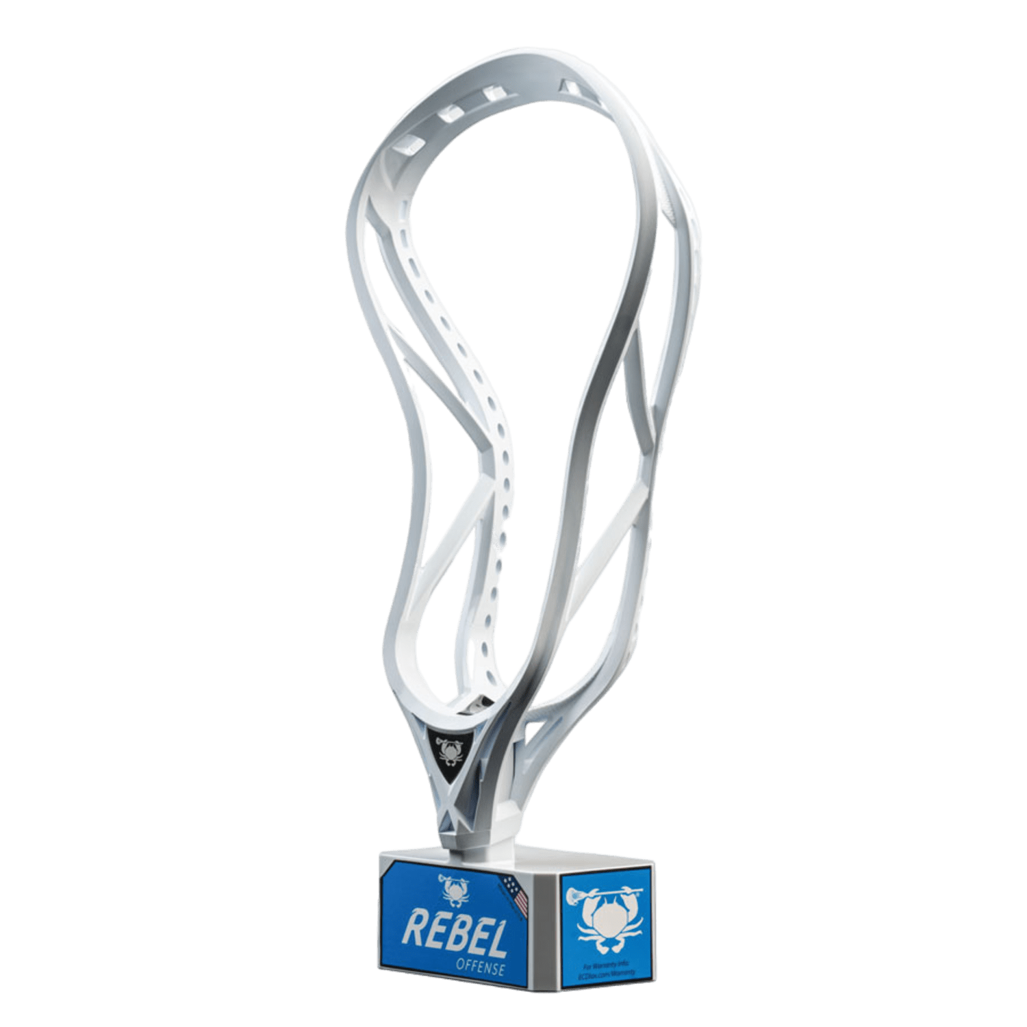 The ECD Rebel Offense Lacrosse Head by East Coast Dyes is mounted on a base, showcasing its sleek white design with blue and black accents. The head provides a stiff and aggressive shooting experience and features the company's logo near the base. Additionally, it comes with a mid pocket setup, all set against a transparent background.