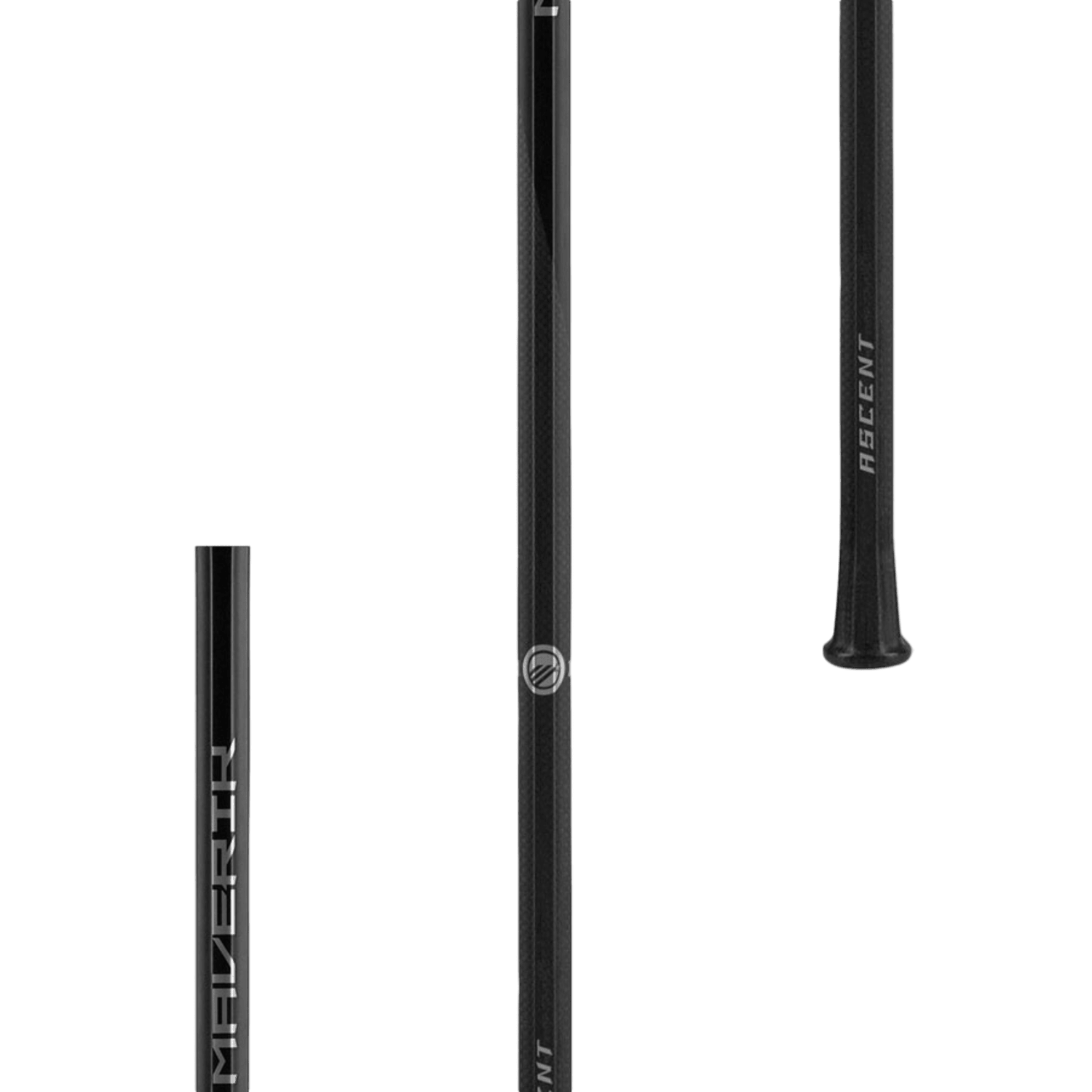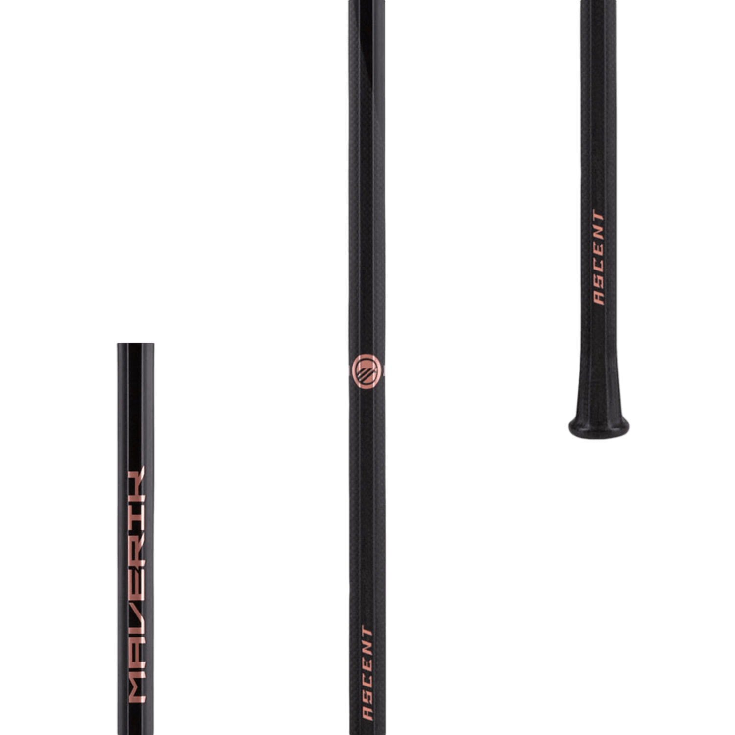 A Maverik Ascent Lacrosse Shaft for women, ideal for an elite midfielder, is presented in black with bold white lettering, displayed from various angles to highlight its full length and logo details optimized for draw control.
