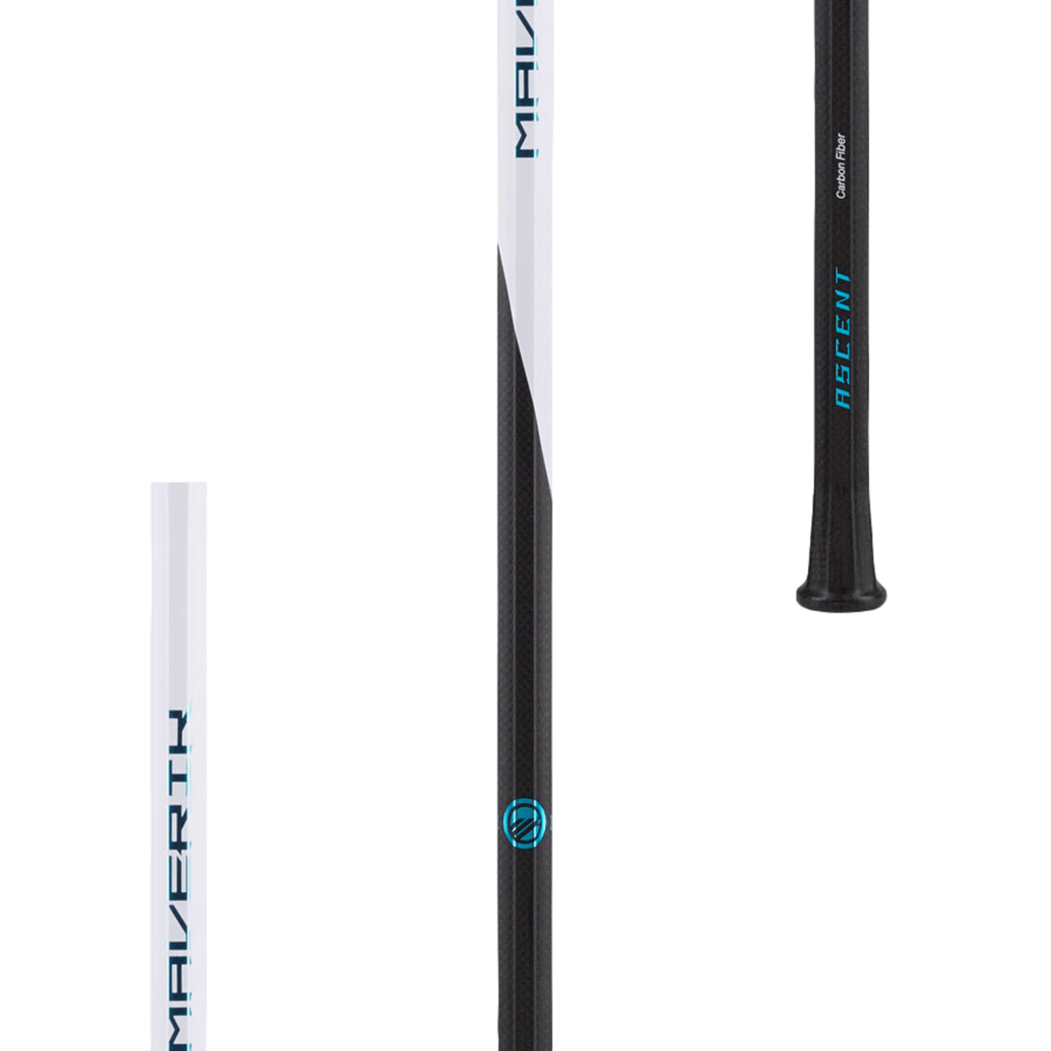 A close-up view showcases the Maverik Ascent Lacrosse Shaft in a white and black design tailored for elite midfielders. The shaft's carbon texture is adorned with blue Maverik branding, making it ideal for precise draw control. Separate shots of the top and grip areas emphasize the intricate design and text details on this women's lacrosse handle.