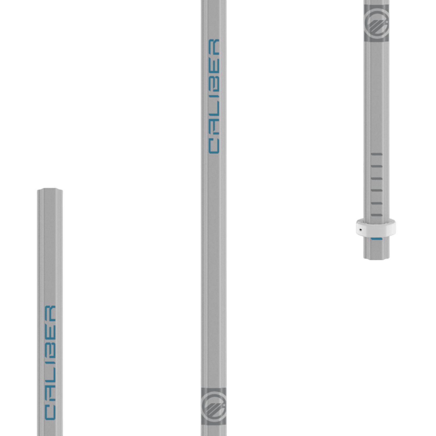The Maverik Caliber 2024 Defense Lacrosse Shaft, with its sleek and modern design, features three vertical silver poles adorned with the word "CALIBER" in blue. Made from a military-grade scandium-titanium alloy, it includes a circular logo near the top and one pole has a white adjustable clamp, making it ideal for Maverik Caliber Defense requirements.