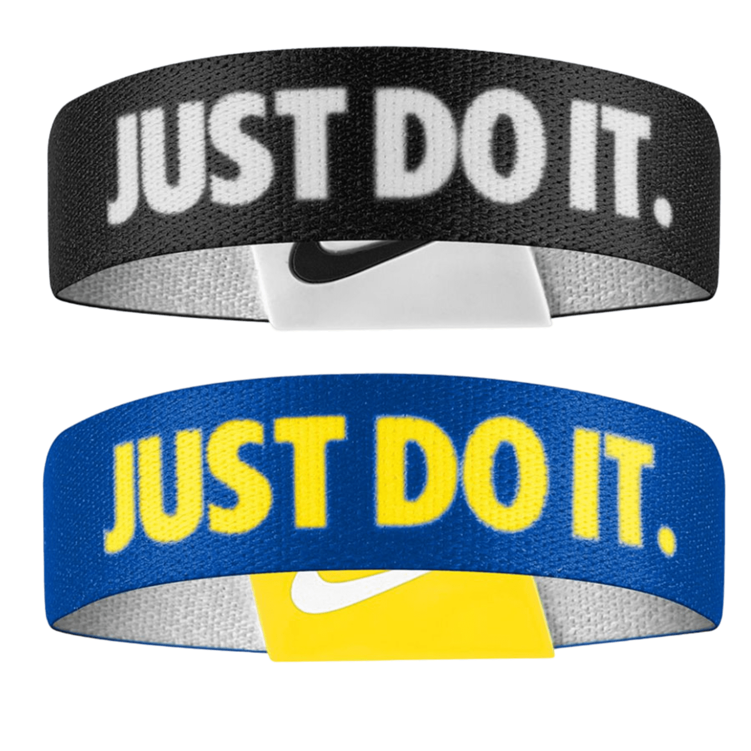 The display showcases two Nike Baller Bands from the renowned brand Nike. The upper band is black adorned with the iconic white "JUST DO IT" text, and the lower band comes in blue with striking yellow lettering. Each flexible elastic band features a small logo underneath and offers reversible options for adaptable styling.