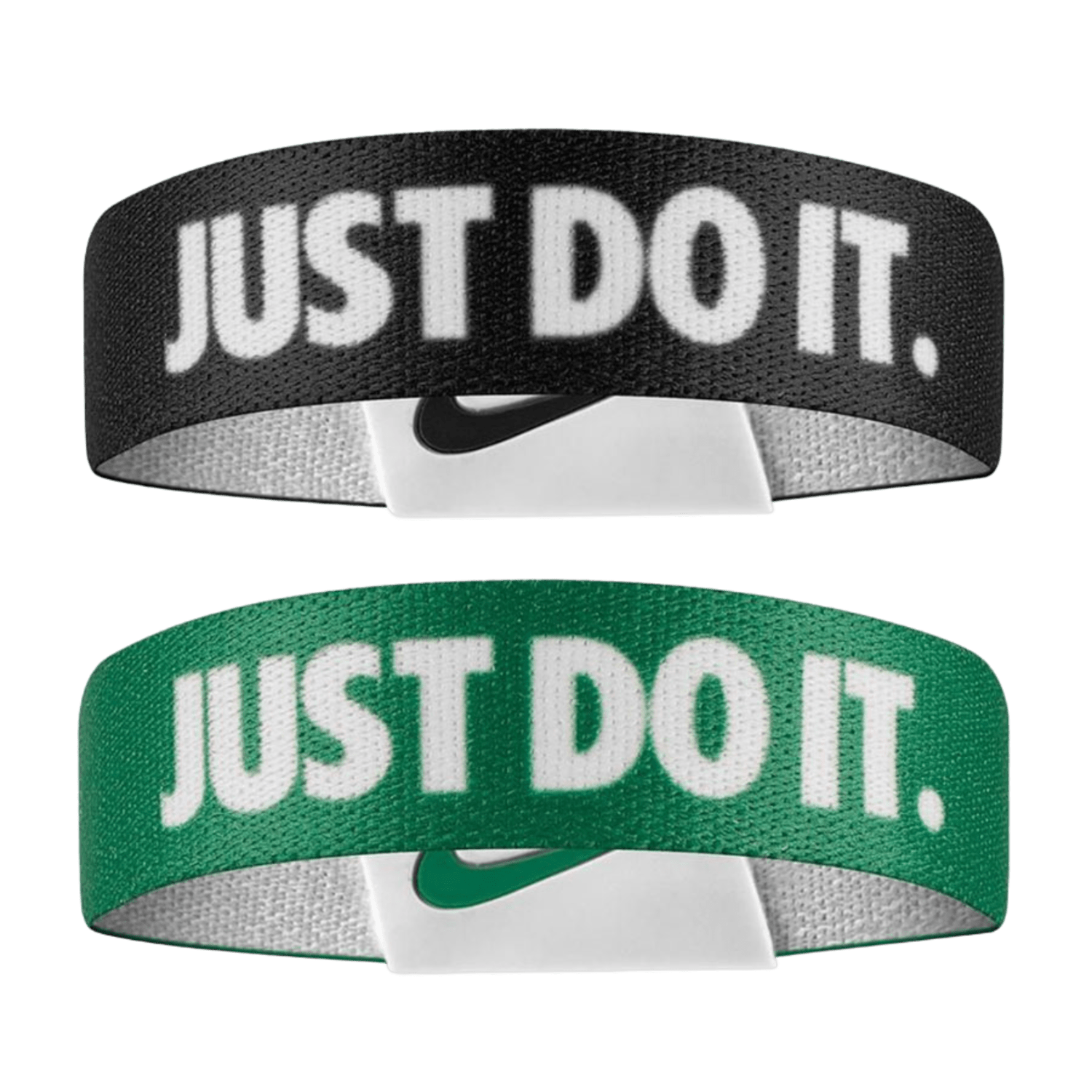 Introducing the N.000.2506.008.ML Nike Baller Bands: These versatile wristbands are reversible, showcasing the iconic "JUST DO IT" phrase in black with white text and green with white text. Crafted from a stretchy elastic material, each band also features a small Nike logo for signature style.
