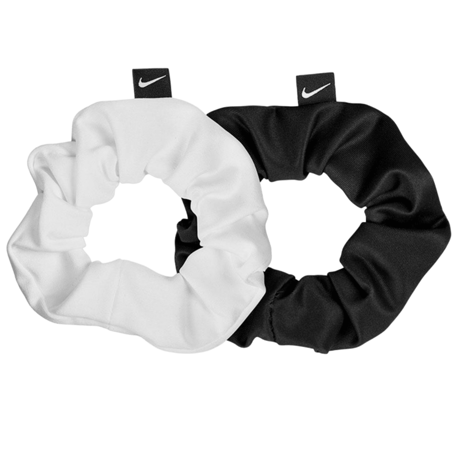 Two scrunchies, one in white and the other in black, each adorned with a small black Nike tag featuring the iconic logo, are displayed. The Nike Gathered Hair Ties-2 Pack offers a ruffled texture, ideal for keeping your hair secure during workouts. They are placed next to each other on a simple background.