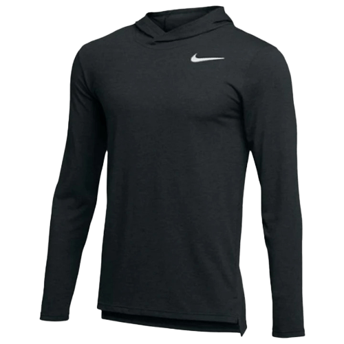The Nike Jordan Alpha Dry LS Hooded Top is a sleek black long-sleeve athletic hoodie featuring a small white Nike logo on the left chest. Its simple design makes it suitable for both sports and casual wear.