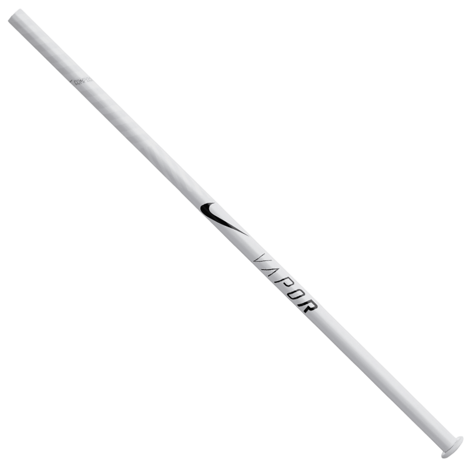 The Nike Vapor Composite Lacrosse Shaft in white prominently displays the Nike logo and the word "VAPOR," made from carbon fiber to boost performance. Its textured finish ensures outstanding grip and control during play.
