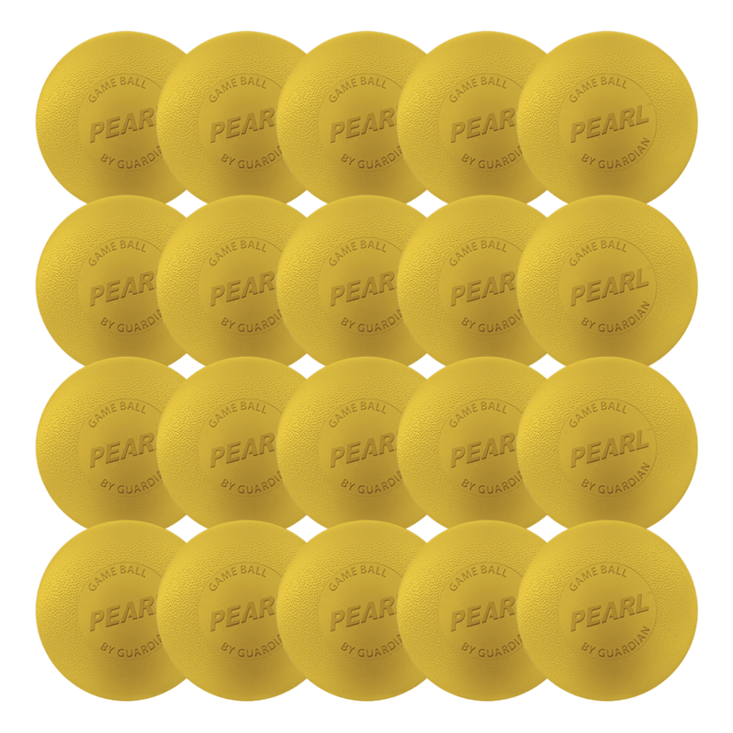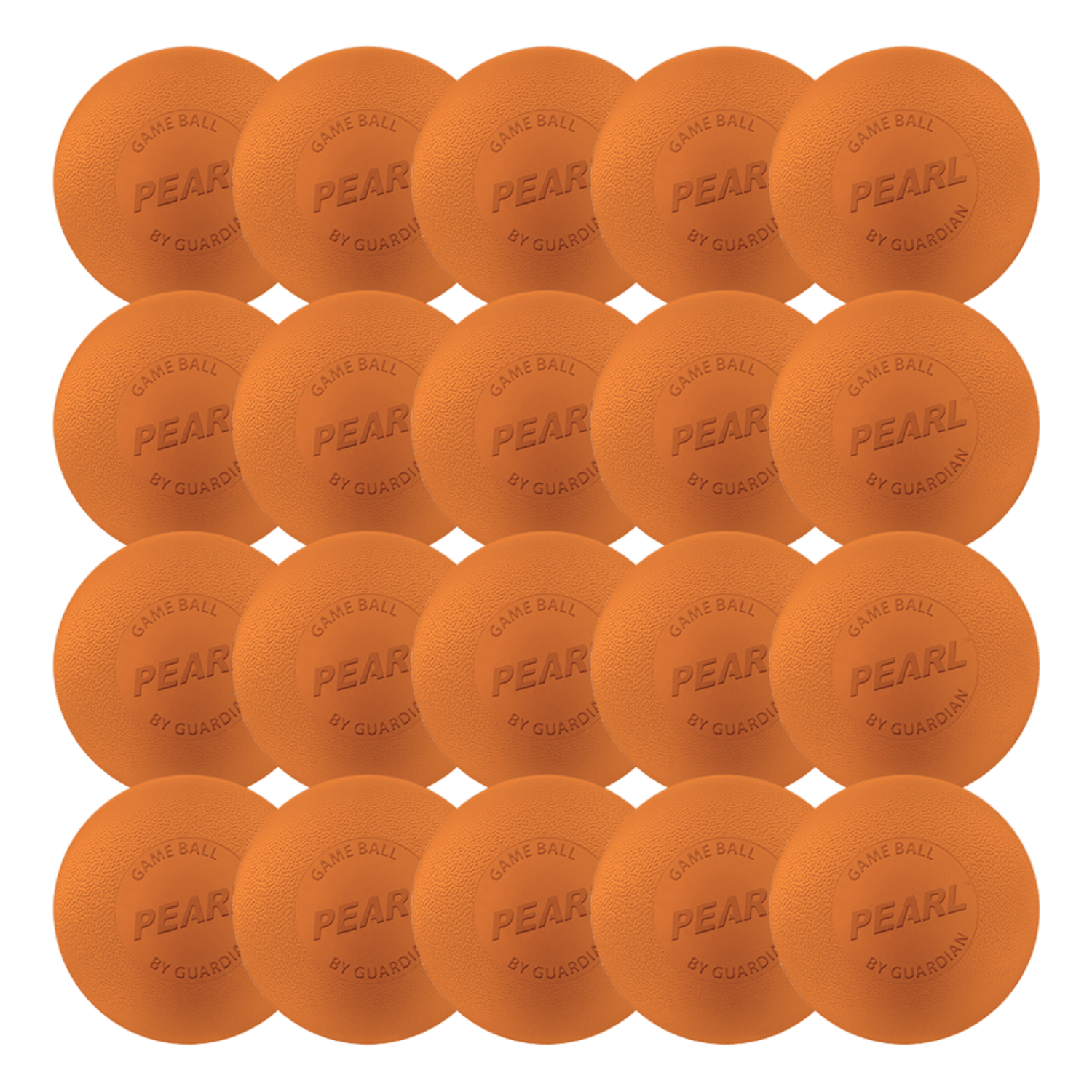 A grid of 16 identical, textured Pearl LT lacrosse balls from the brand Pearl, each featuring the text "Game Ball Pearl by Guardian," are perfectly arranged against a clean white background. These balls meet NOCSAE official game specifications.