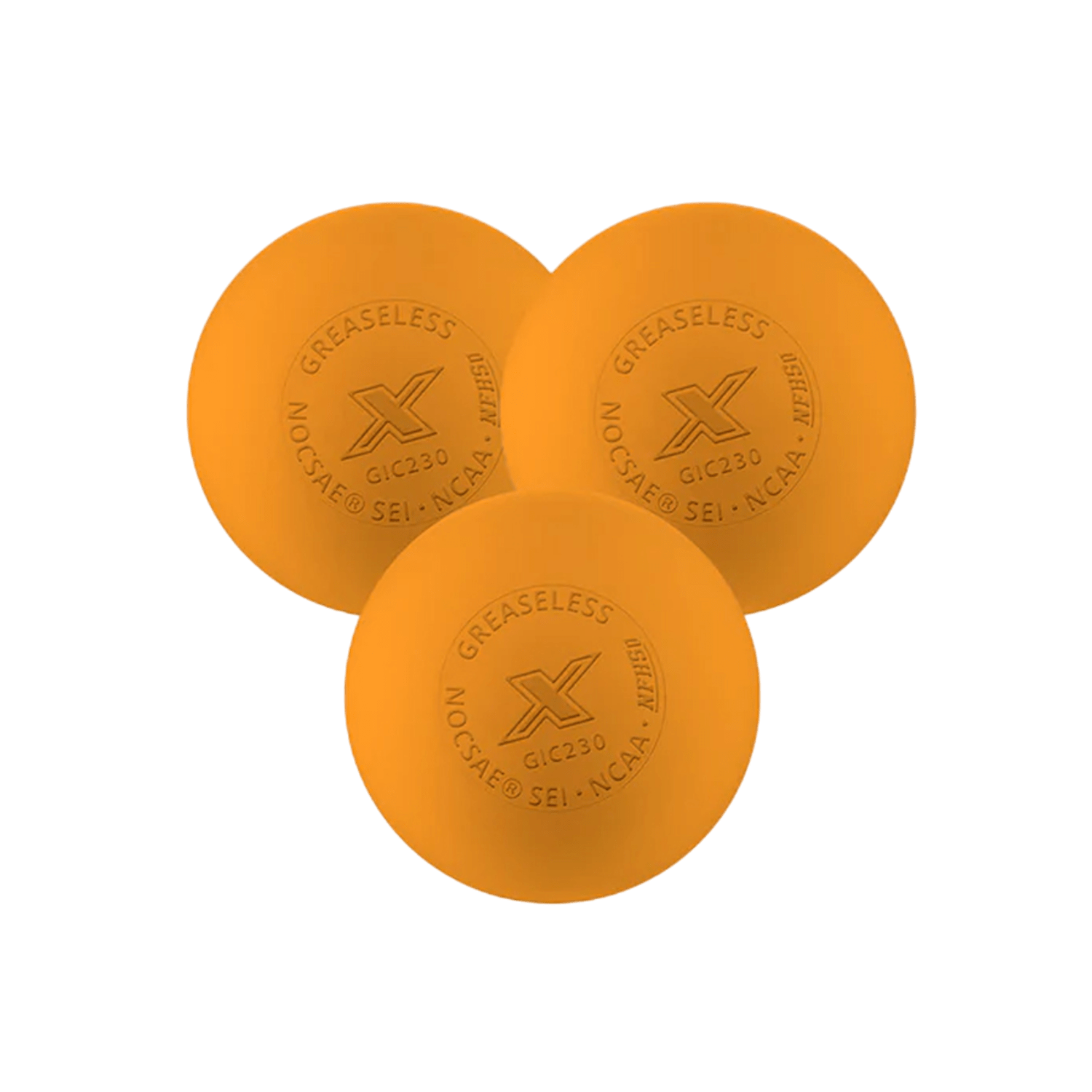 Three bright orange Pearl X Lacrosse Balls, each proudly displaying the word "Greaseless" along with model details, are arranged in a perfect triangular formation against a vivid green backdrop. These exceptional Pearl X models come with an impressive Grease-Free Guarantee, ensuring unmatched performance.