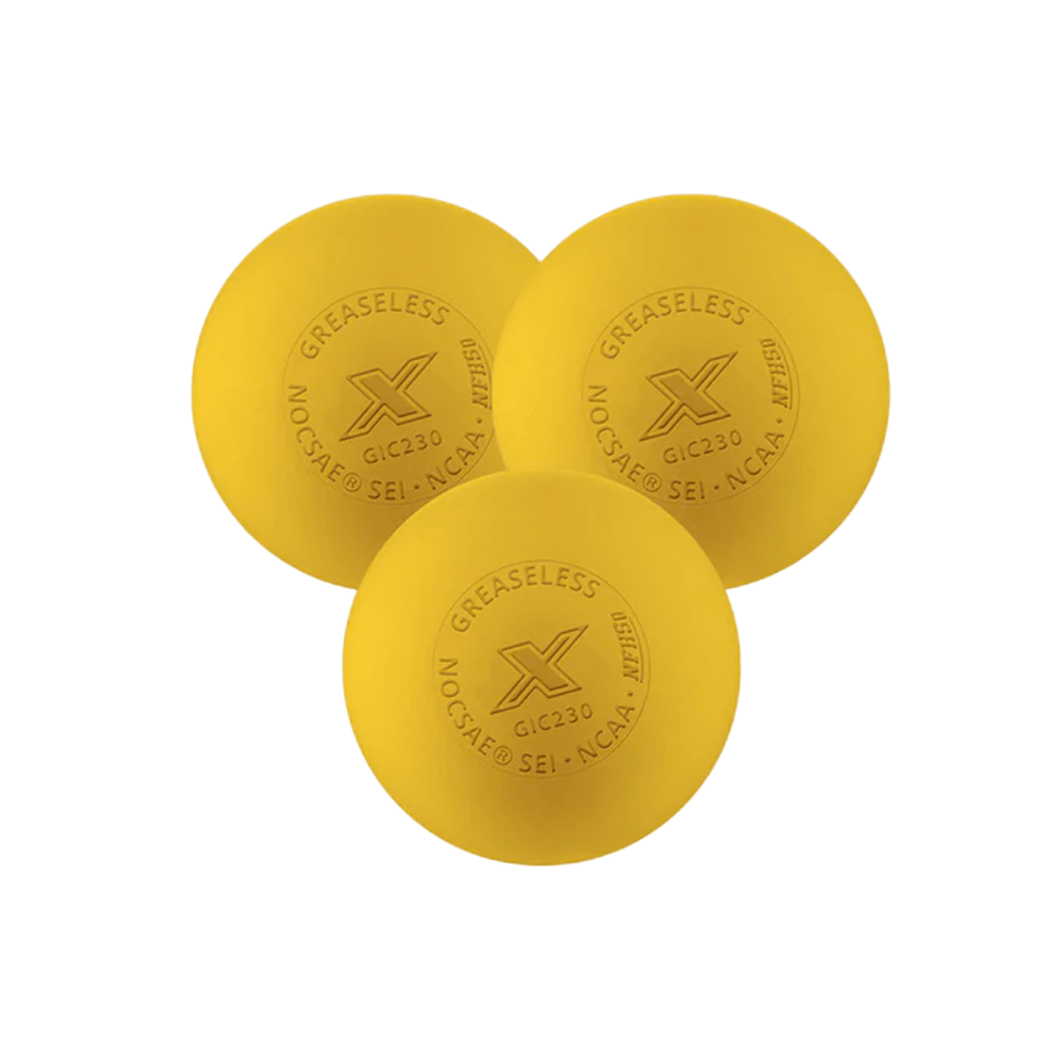A set of Pearl X Lacrosse Balls - 3-Pack in yellow, each embossed with "Greaseless" and "NOCSAE SEI NCAA," displayed in a triangular arrangement against a simple backdrop, highlighting the Grease-Free Guarantee.
