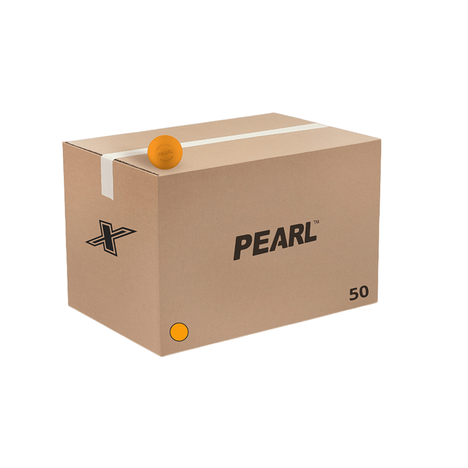 A large box with the "Pearl" brand name and stylized "X" logo prominently displayed rests against a green background, indicating it contains a 50-pack of Pearl X Lacrosse Balls. An orange lacrosse ball, designed to be grease-free for consistent performance, sits on top.