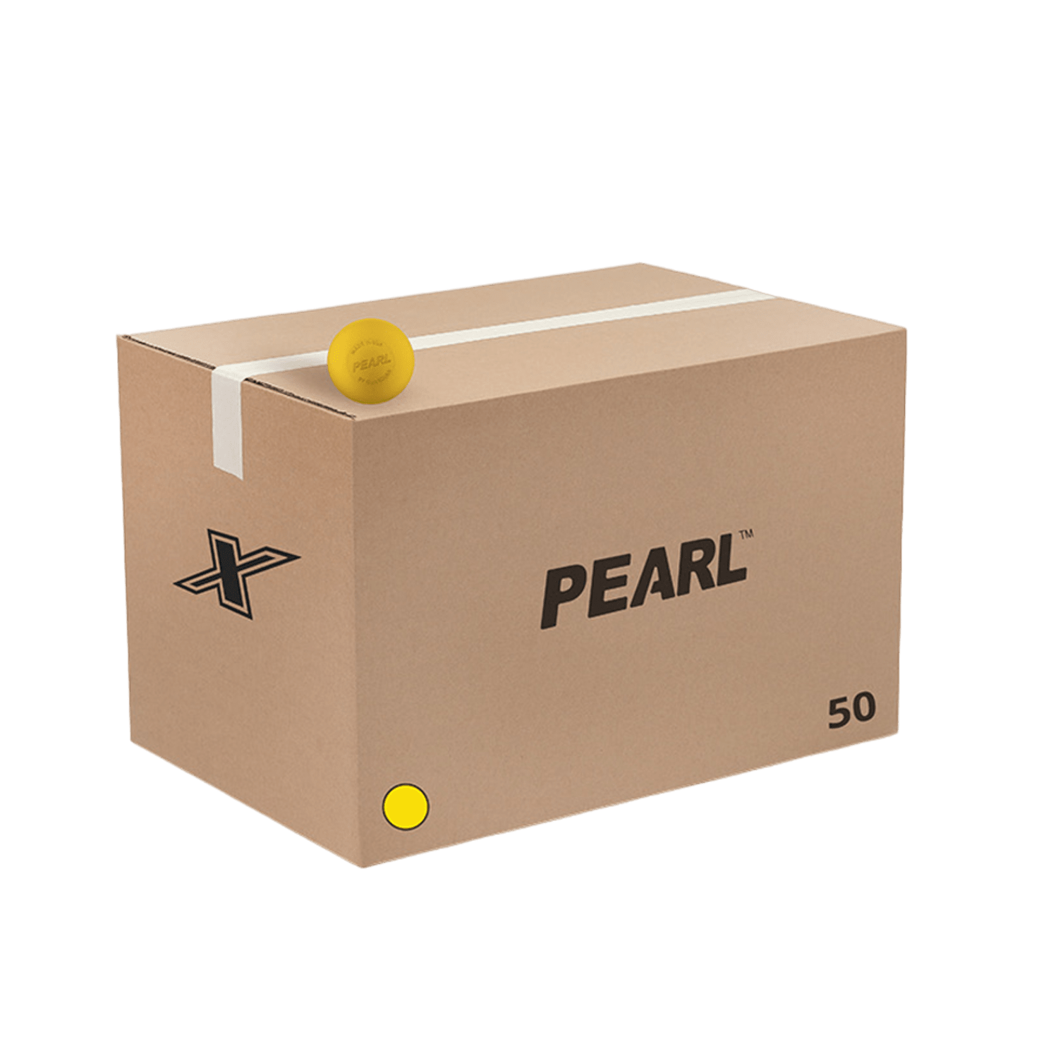 A neatly sealed, large brown cardboard box labeled "Pearl X Lacrosse Balls - 50-pack" with a small yellow circular sticker sits grease-free. On top of the box rests a yellow ball resembling a lacrosse ball.