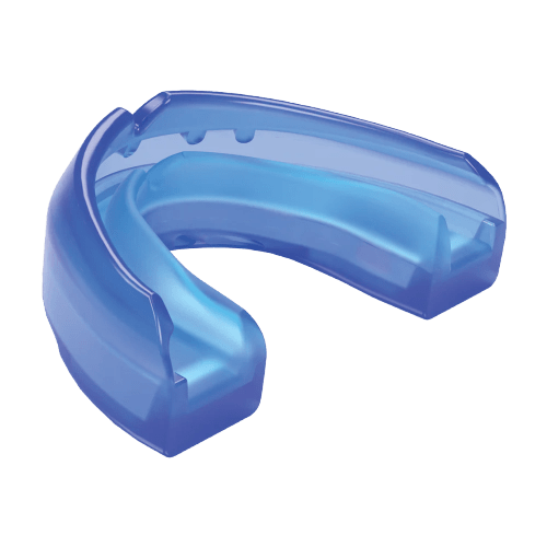 A clear and blue ShockDoctor Ultra Braces Mouthguard by ShockDoctor, specifically designed for teeth protection. Ideal for young athletes, it has a curved shape that fits comfortably over braces and features a dual-layer structure to provide enhanced durability during lacrosse and other sports.
