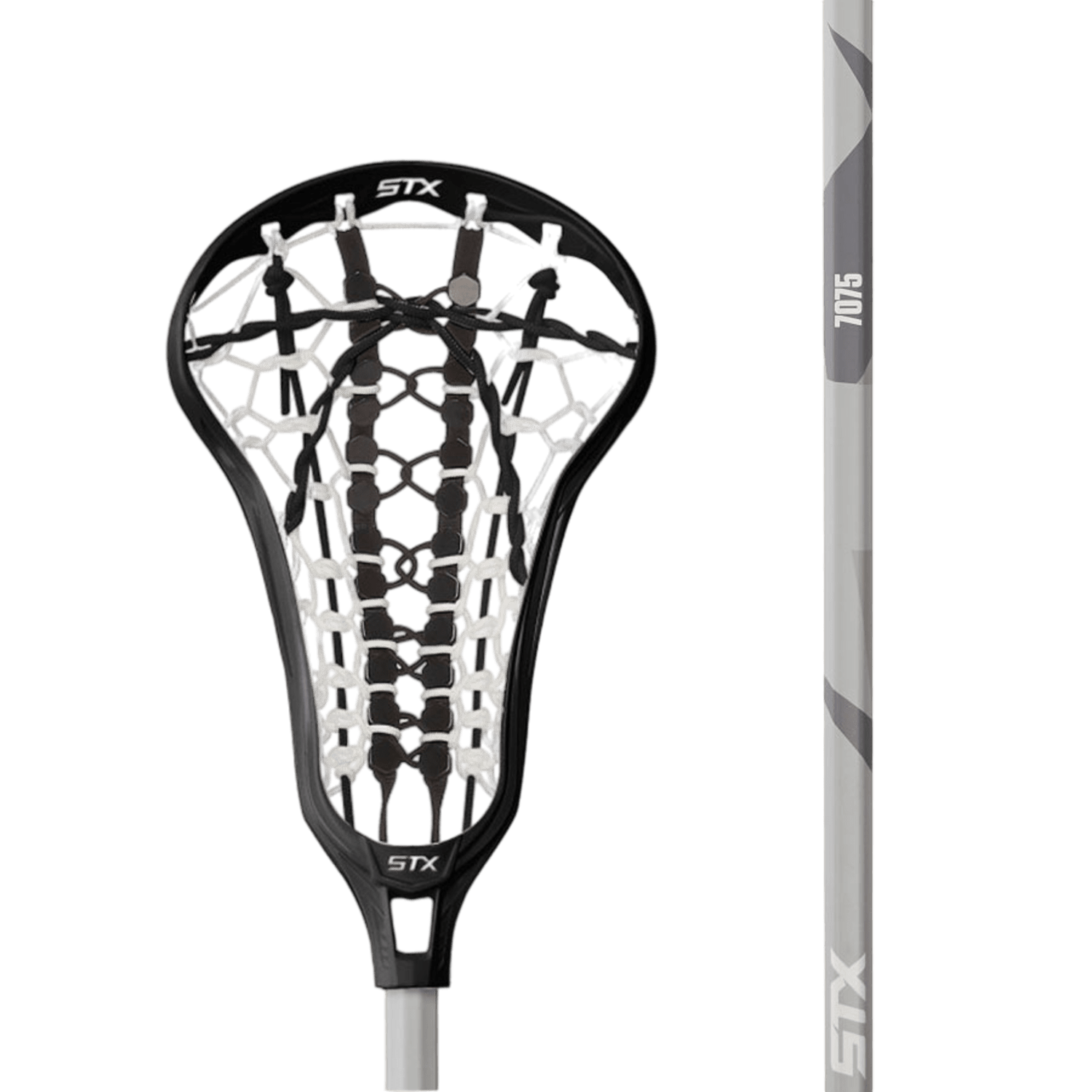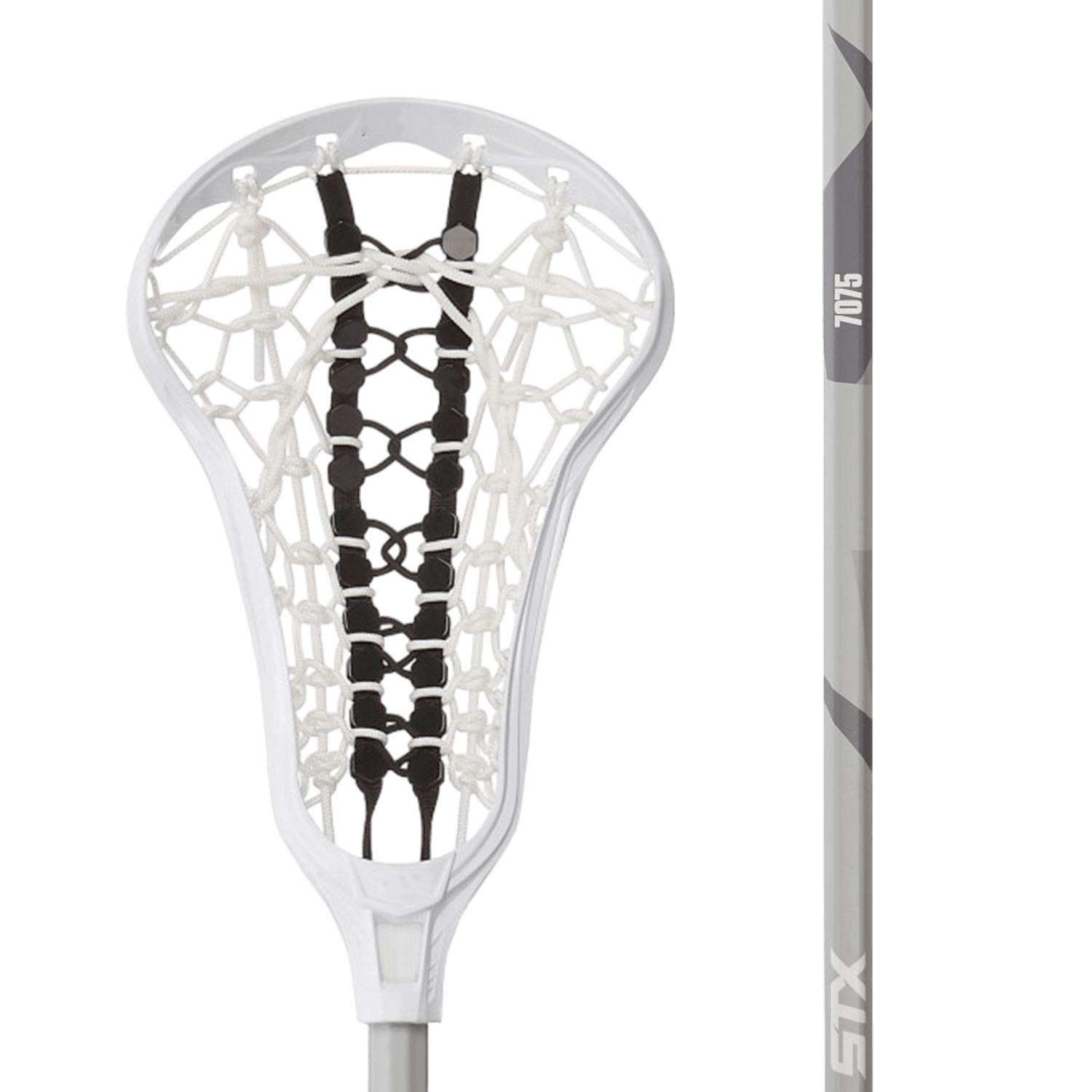 The STX Crux 400 Complete Stick by STX is an ideal choice for beginner women's lacrosse players, featuring a black and white mesh head paired with a gray shaft adorned with the number "7075" in subtle markings.