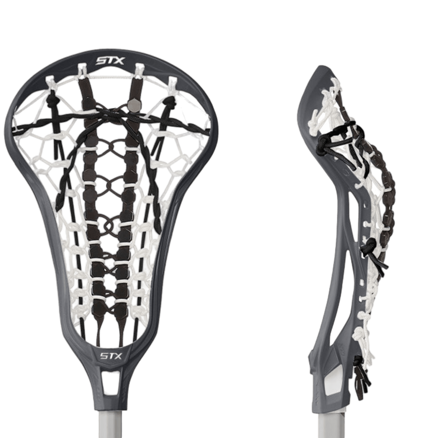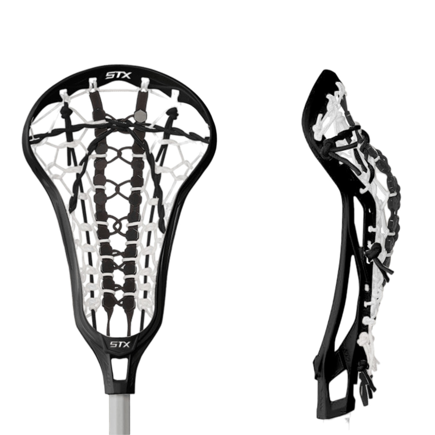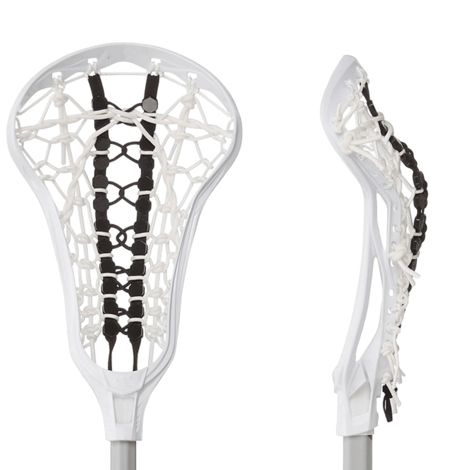 Close-up of two lacrosse stick heads, side by side. The front view showcases the intricate stringing pattern, while the side view highlights the curved structure. Both are predominantly white with black and white mesh, resembling the design of an STX beginner-level product similar to the CS CR40 BK RW/AWX4 70/GS.