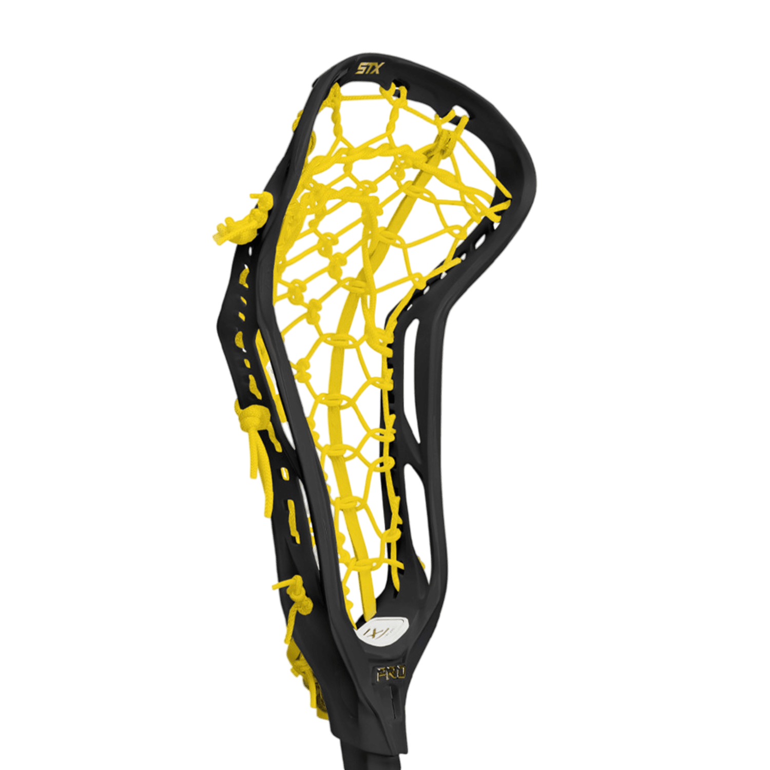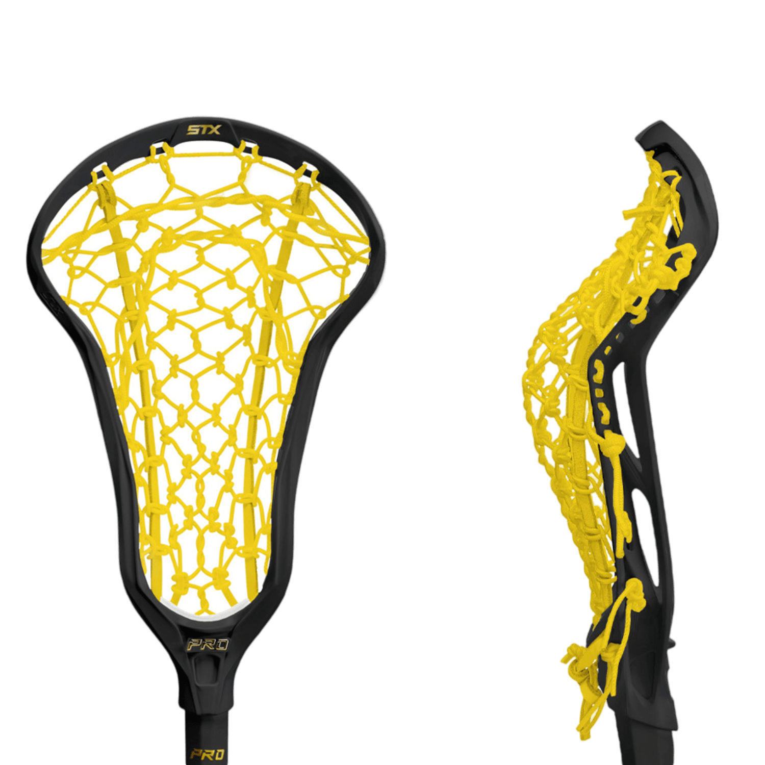The STX Crux Pro Lock Pocket Strung Lacrosse Head from STX boasts a black frame complemented by intricately woven bright yellow netting, highlighting its Lock Pocket design for precise catching and throwing. Enhanced with EnduraForm™ technology, it delivers durability when viewed from both the front and side.