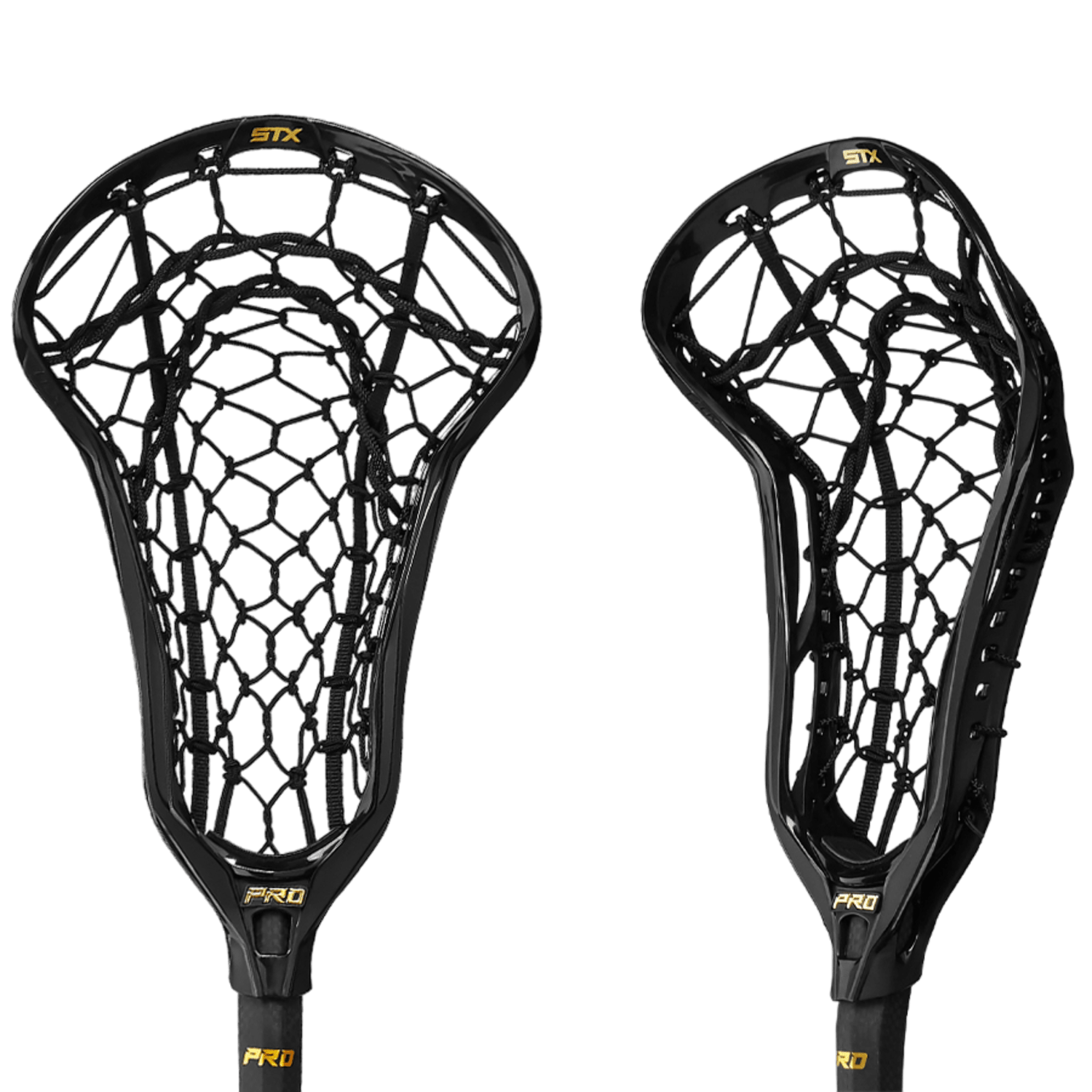 The STX Crux Pro Lock Pocket Strung Lacrosse Heads, distinguished by black hues and yellow "STX" logos, incorporate advanced EnduraForm™ technology. The tightly woven mesh features a Lock Pocket design, displayed from front and side perspectives against a plain backdrop to emphasize their precision and craftsmanship.