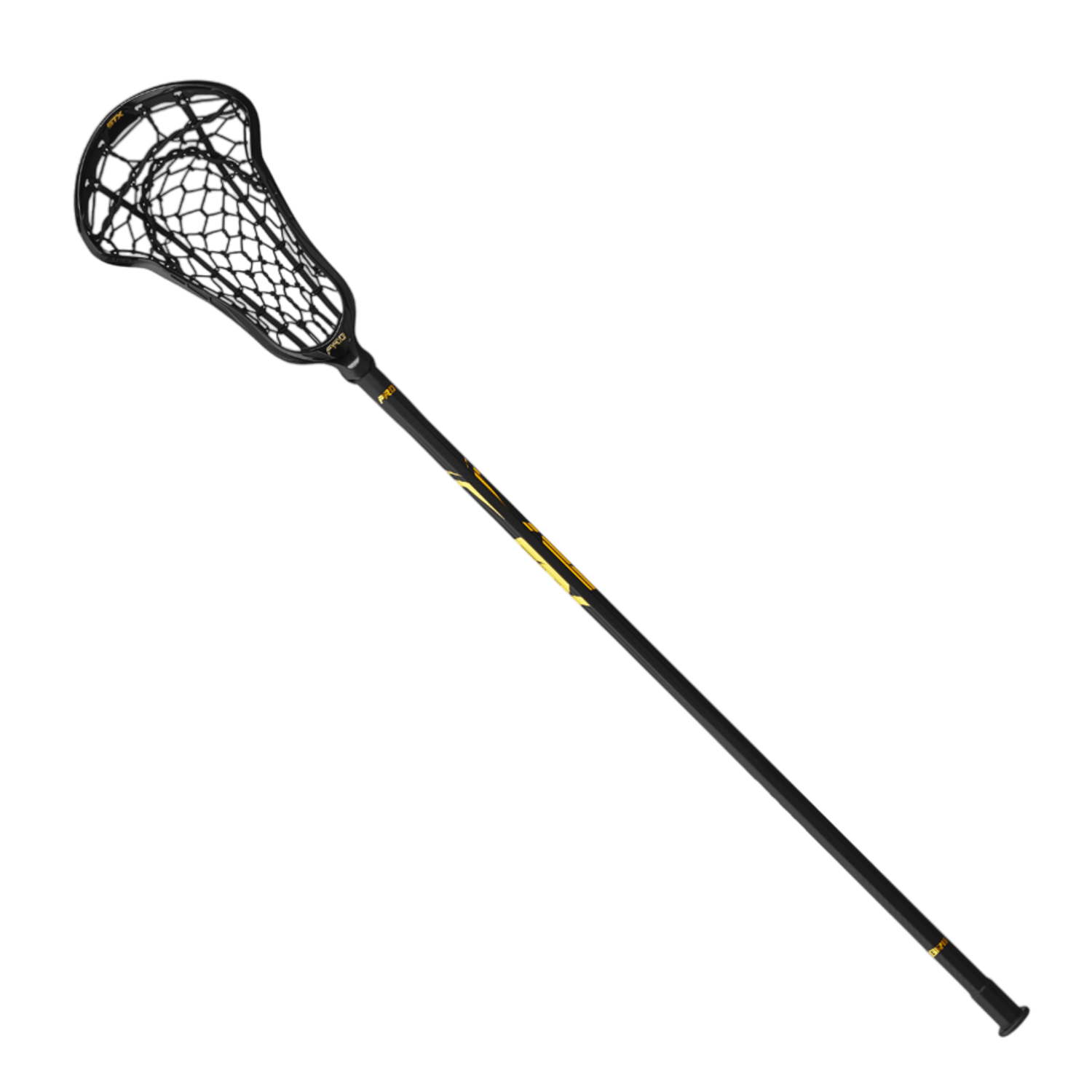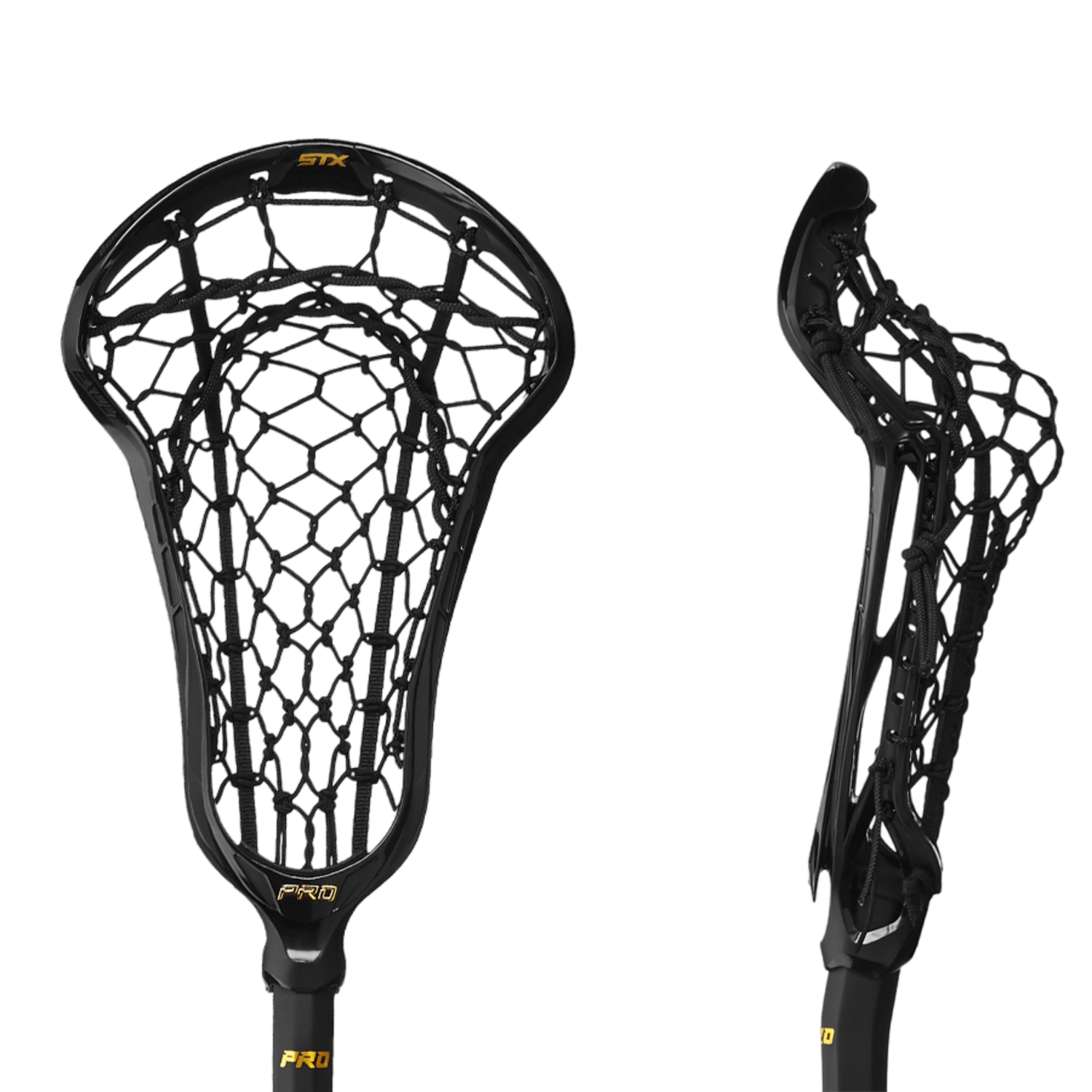 The STX Exult Pro Lock Pocket Complete Stick by STX showcases a sophisticated black design, featuring a woven Lock Pocket net at the top and a shaft highlighted with gold accents against a simple backdrop.