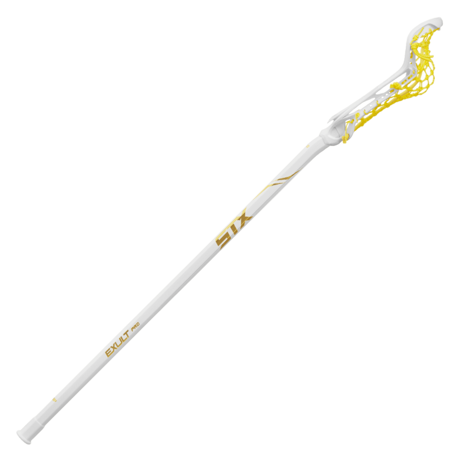 This close-up showcases the STX Exult Pro Lock Pocket Complete Stick, highlighting its detailed craftsmanship. The lacrosse stick features vibrant yellow netting in the Lock Pocket and displays a shimmering gold "Exult Pro" label along the upper handle.