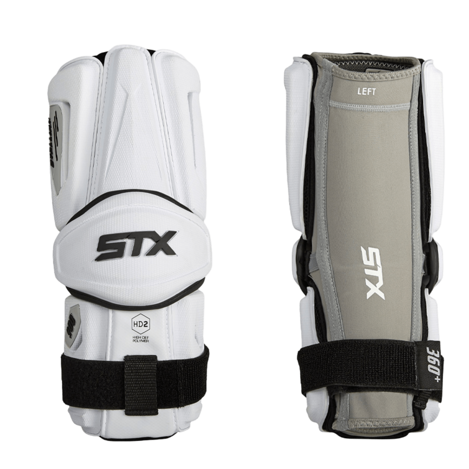 The image displays two lacrosse arm pads. The one on the left is white, adorned with "STX" branding and detailed stitching. The pad on the right, identified as the STX Stallion 900 Arm Guard by STX, incorporates HD2™ foam and a gray interior. It also features a 360+ strap that ensures a secure fit, with consistent branding throughout.