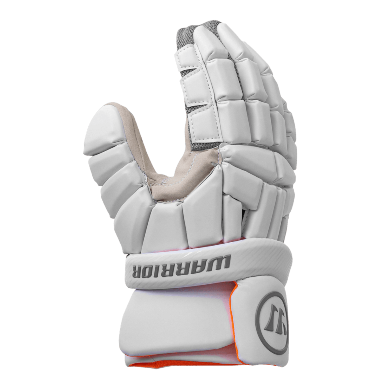 Experience the Warrior Burn 2024 Lacrosse Gloves, a white protective sports glove designed with thick padding for high-impact activities like lacrosse. These gloves feature Warrior's Bone System for enhanced protection and a Pro Palm for superior grip. They also showcase the signature logo on the wrist strap and have a segmented design to enhance flexibility.