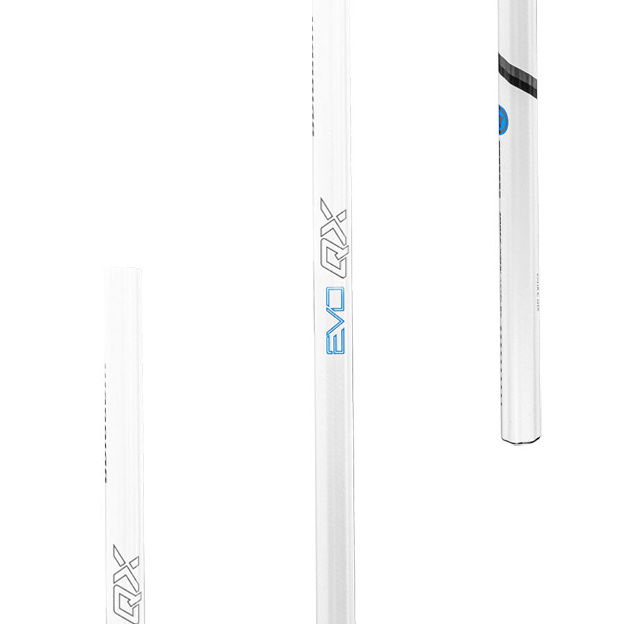 The Warrior Evo QX Carbon Lacrosse Shaft features a minimalist design with white shafts accented in blue and silver. Made from lightweight carbon fiber, each shaft is perfectly vertical for a striking appearance. The "EVO QX" branding prominently emphasizes its status as a high-end carbon attack shaft by Warrior.